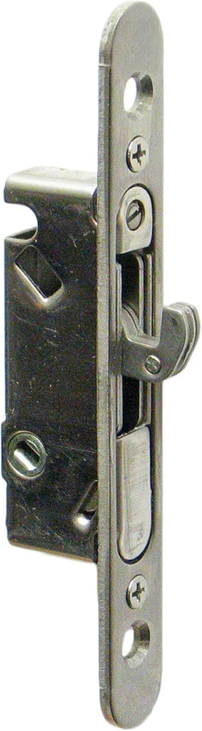 Stainless steel sliding door mortise lock with faceplate. 4-5/8" Mounting Hole Centers. Stainless Steel lock. Round face mortise lock with 45 degree latch hole. Our most common mortise lock. Used on Amesbury door handles, Sash Controls, PGT, Silverline and many others.